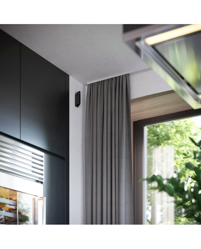 Melnā krāsa padara detektoru diskrētu un viegli pieskaņojamu tumšākiem logu rāmjiem vai modernam interjeram. Ierīce izmanto divus PIR sensorus un viedo ZOP algoritmu, kas nodrošina izcilu noturību pret viltus trauksmēm no caurvēja, mājdzīvniekiem vai saules atspīdumiem.